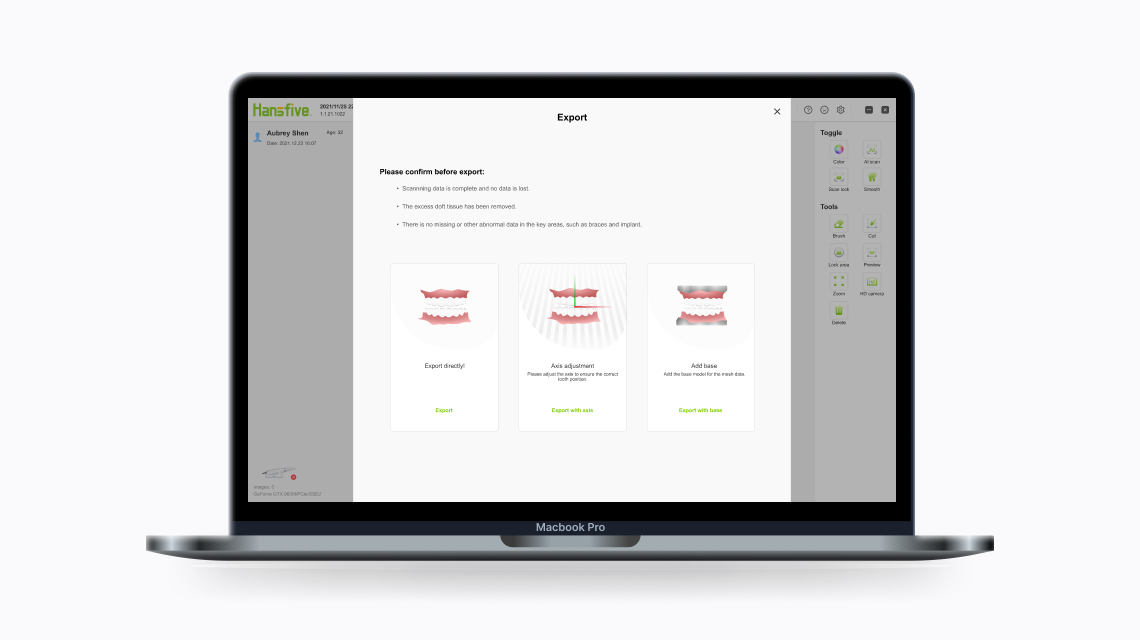 The IS 200 supports the import and export of data in STL, OBJ, PLY formats, and is compatible with mainstream design software such as 3Shape and Exocad.